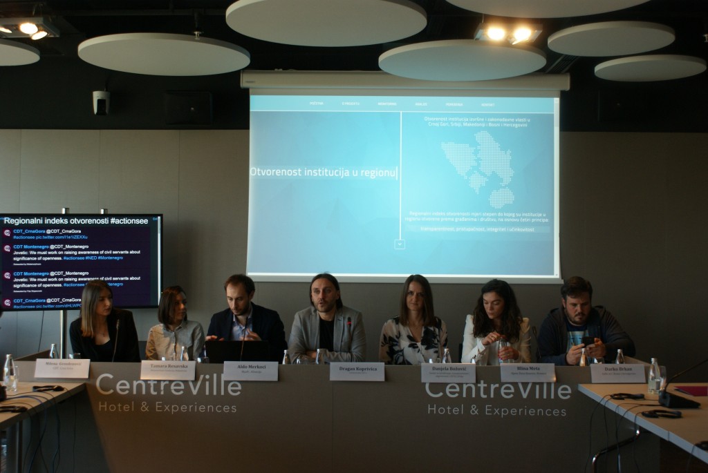 The press conference titled “Openness of institutions of executive power in the region and Montenegro” took place on April 24, at the CentreVille hotel in Podgorica. This event saw the presentation of the results of the research on openness of executive powers in the region, carried out within the project ACTION SEE – Accountability, Technology and Institutional Openness Network in SEE.