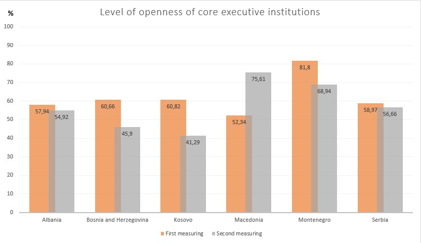 International standards, recommendations given in multiple EU reports on countries in the region as well as good practices examples were followed during the measuring of the level of institutional openness. The institutions were assessed by using specific quantitative and qualitative indicators, such as: access to information on institutions’ official websites, legal framework’s quality in individual cases, other sources of public informing, published data regarding the work of institutions, public procurements, information on spending of public money, etc.